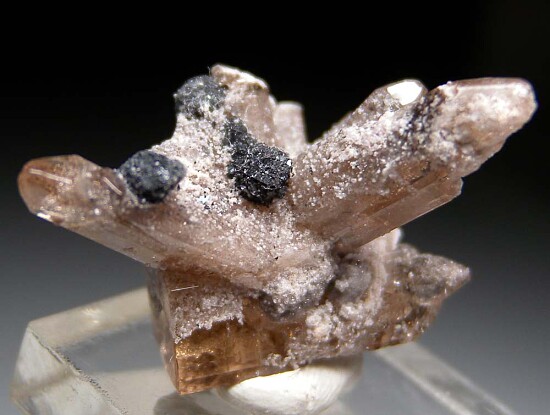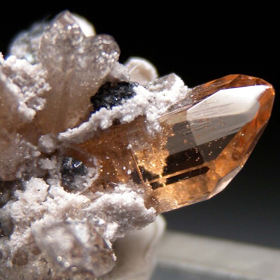 Glassy, transparent golden Topaz crystals from the Maynard (Bixby) Mine in Utah. A fabulous spray formation with attached balck crystals of Hematite pseudomorphed after garnets. Stunning specimen mined in 2003 by John Sulzbach. Ex. John Sulzbach collection.