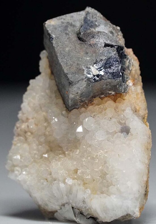 A sharp 3cm Galena crystal on drusy Quartz crystals. The Galena shows surface alteration to Anglesite. Ex. John Sulzbach collection, collected by John in May 2014 from the Sunshine Adit #3.
