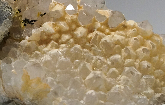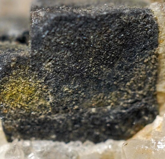 A sharp 1.3cm Galena crystal on drusy Quartz crystals. The Galena shows surface alteration to Anglesite. Ex. John Sulzbach collection, collected by John in May 2014 from the Portales Wall.