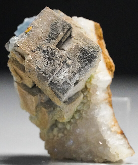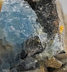 A 3cm cluster of Galena cubes on drusy Quartz crystals. Behind the clsuter is a 1.3cm blue Fluorite cube. The Galena shows surface alteration to Anglesite. Ex. John Sulzbach collection, collected by John in May 2014 from the Portales Wall.