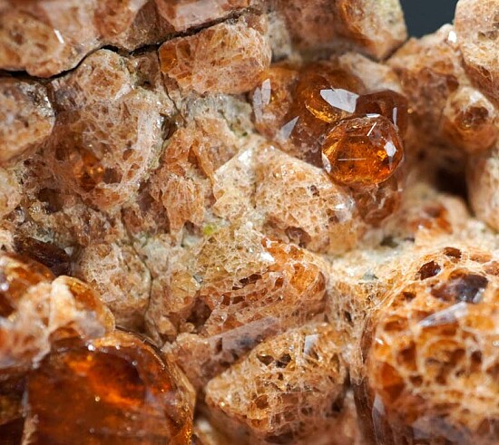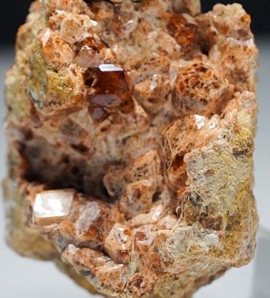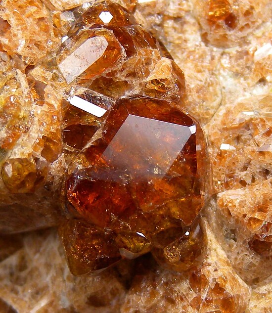 Large vug lined with lustrous orange Garnet crystals from near Bishop, California. There are both more opaque, lighter orange crystals and gemmy deep orange crystals present in the vug, all have good luster. Ex. John Sulzbach collection, self collected by John in August 2005.
