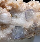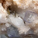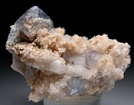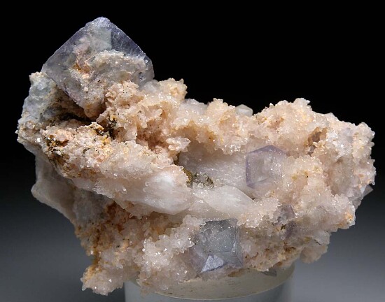Cubic Fluorite crystals on Quartz from the prolific Yaogangxian Mine. The Fluorite cubes reach 3cm in size and the smaller cubes are light purple/blue and very transparent. The Quartz is a mixture of larger crystals and smaller, drusy peachy colored crystals. There is also a thin wafer-like crystals of Pyrrhotite and some Pyrite making this a colorful piece and a classic Yaogangxian combo specimen.