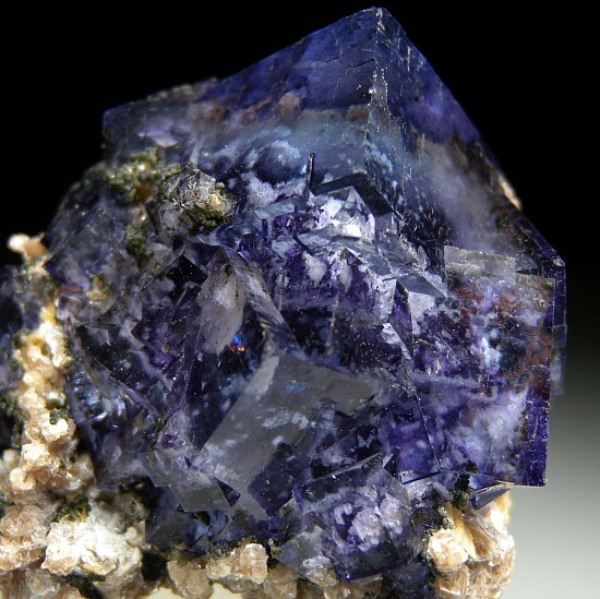 Stunning specimen of transparent purple/blue Fluorite crystals from the famous Yaogangxian Mine in China. The Fluorite crystals are glass-like and totally water clear (you can see right through them to the matrix underneath). In excellent condition from recent production and associated with yellow Muscovite crystals.