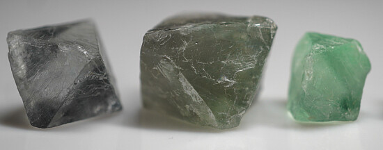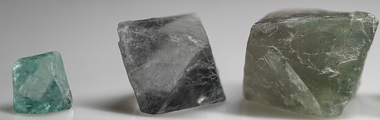 Five crystals of green Fluorite from China. These are cleavage octahedra to 2.2cm wide of varying shades of green, all nicely transparent.