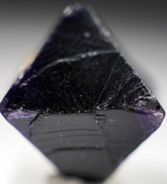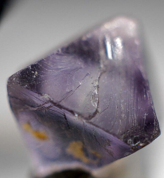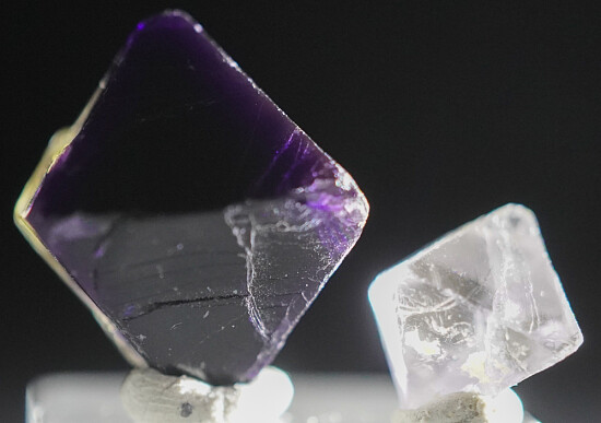 Two crystals of purple Fluorite from Illinois. These are cleavage octahedra to 1.6cm wide. ONe is dark purple and the other is a beautiful lavendar and transparent.
