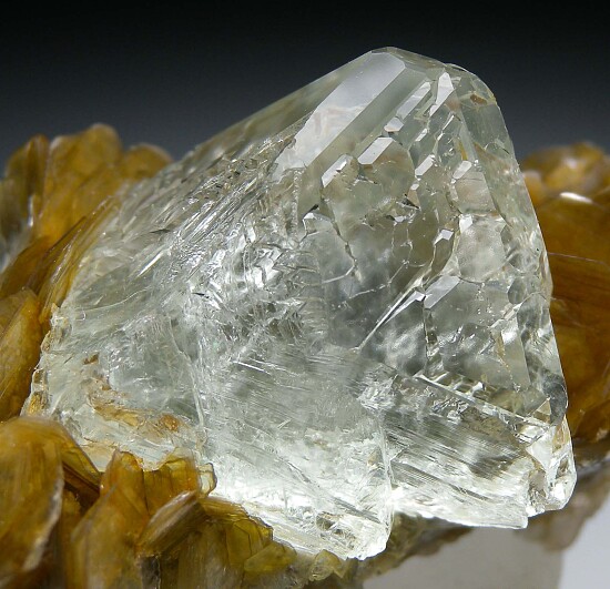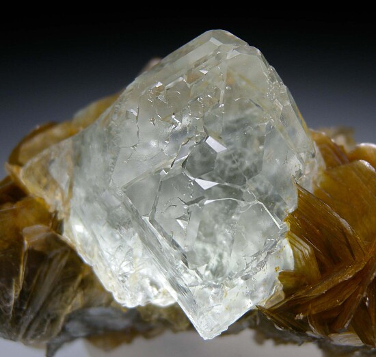 Water-clear, glassy single octahedral Fluorite crystal set in blades of Muscovite. The Fluorite crystal is bright and undamaged with beveled edges and a blue/green color (the camera did not pick up the color, but a light blue/green is apparent in person). Ex. Len Pisciotta collection.