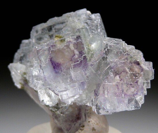 Glassy, ransparent stepped cubic Fluorite crystals from the Yaogangxian Mine. The Fluorite is a light blue with purple phantoms. Green Chlorite and yellow Muscovite grew over parts of an earlier generation of the Fluorite and were overgrown by later generations.