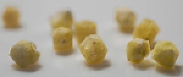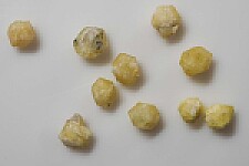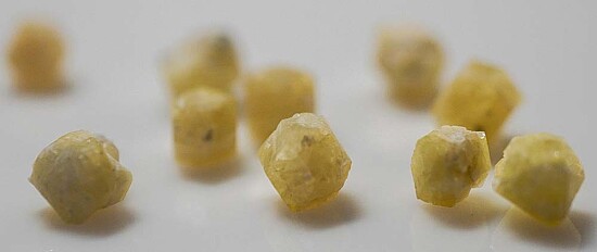 Parcel of 10 crystals of yellow Rhodozite from Madagascar. Rhodizite has a hardness of 8 and forms a solid solution series with Londonite. Chemical analyses is required to evaluate potassium and cesium amounts to determine the species.
