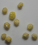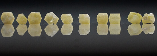 Parcel of 10 crystals of yellow Rhodozite from Madagascar. Rhodizite has a hardness of 8 and forms a solid solution series with Londonite. Chemical analyses is required to evaluate potassium and cesium amounts to determine the species.