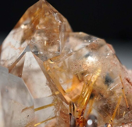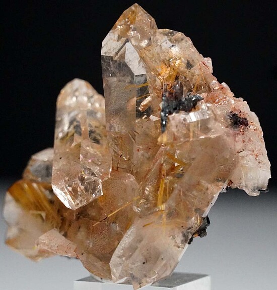 Transparent, light smokey Quartz crystals with Hematite and inclusions of golden Rutile needles. Well crystallized all around quality specimen from the Len Pisciotta collection. Valued at $250.