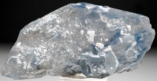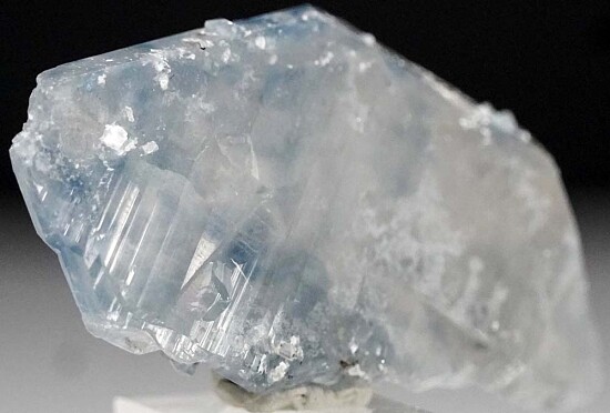 Doubly-terminated blue Quartz crystal from Afghanistan. Tabular, transparent single Quartz crystal with blue coloration due to fine Tourmaline inclusions. Well crystallized all around with a few smaller attached Quartz crystals. Pristine, undamaged rare crystal. Ex. Len Pisciotta collection.
