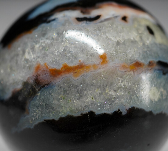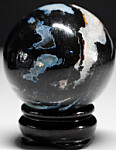 Black Quartz sphere with areas of white banded agate and intergrown Quartz crystals. Intersting sphere with a high polish. Comes with a wooden display stand.