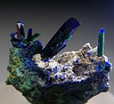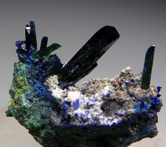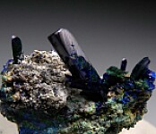 Elongated Azurite crystals on matrix from Tsumeb. This is an old specimen with prismatic Azurite crystals that have partially pseudomorphed to Malachite. The crystals are sharply formed and are transparent with backlighting. The Azurite crystals reach 1.2cm in length. This choice thumbnail can be displayed from either side.