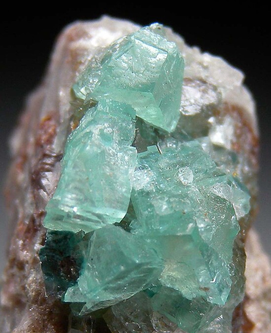 Translucent crystals of Cuprian Smithsonite on matrix from Tsumeb. These blue/green crystals have amazing color and are among the most desireable of all Tsumeb Smithsonite, or any Tsumeb specimen for that matter. This is a small specimen of a very rare type from Tsumeb.