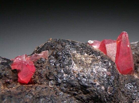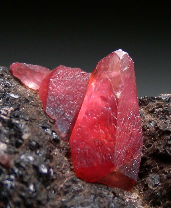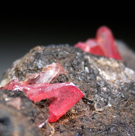 Transparent pink scalenohedral Rhodochrosite crystals on matrix. The largest Rhodo crystal is 1.3cm long. Visually striking specimen with red Rhodo crystals set against a black matrix. Some cleavages present and sawcuts on base and sides. Was listed on my website at $300.