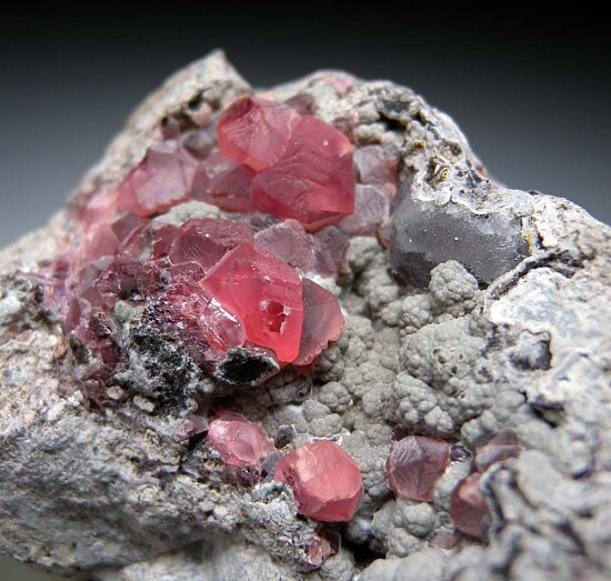 Crystals of red Rhodochrosite and colorless Fluorite in a shallow vug in matrix. Sawcut on base oand side. Old material I recently obtained from a Peruvian miner.