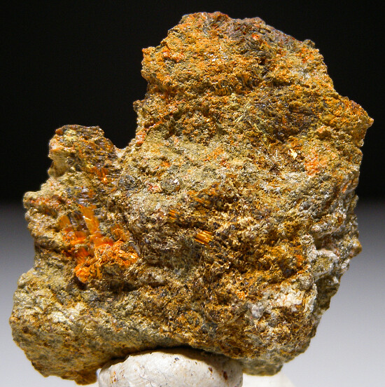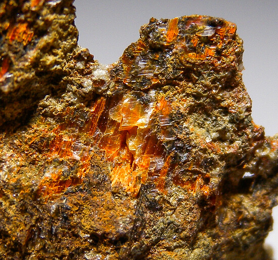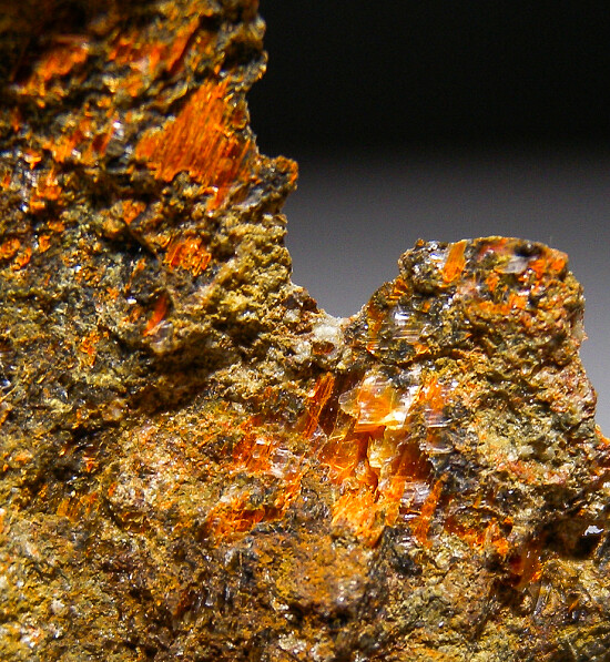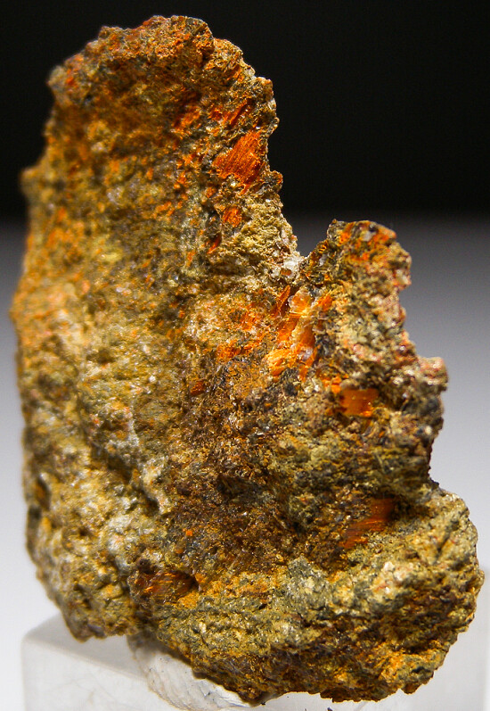Fibrous red/orange crystals of Ludlockite on matrix from a recent find at the Ojuela Mine. Areas of bright, fibrous red Ludlockite in Selenite are present on both the front and backside. This was found recently by a local miner searching for Legrandite and shipped directly to me from Mexico. A few specimens of Ludlockite from Mapimi were also available at the Tucson show in 2023. Ludlockite is a rare lead iron arsenite species and specimens were previously best known from the Type locality of Tsumeb. Ludlockite specimens from Tsumeb were found decades ago from a single boulder and are very hard to obtain. These recent specimens from Mexico make a once very difficult to obtain species available to collectors.