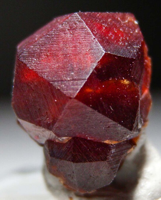 Satiny red Spessartine crystals from a recent find of larger than averge sized crystals for the locality. Translucent crystals, undamaged with finely striated, satiny surface luster.