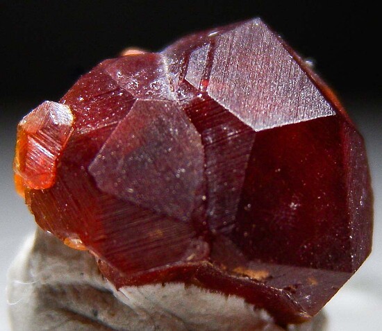 Cluster of translucent red/orange Spessartine crystals from a recent find in China. Good sharp crystals with a satiny, striated surface luster hard to see in the photos.