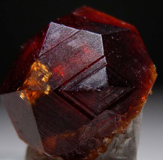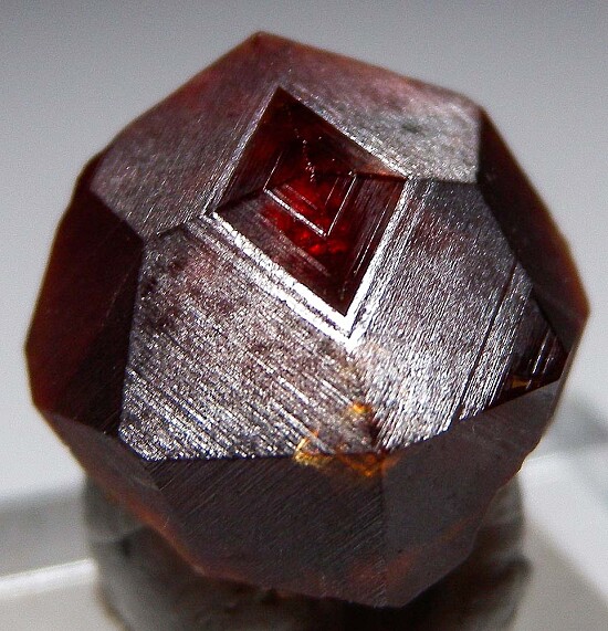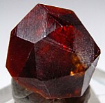 Large single Spessartine from China. Button-shaped crystal (contacted on back) that is translucent red with a satiny striated surface.