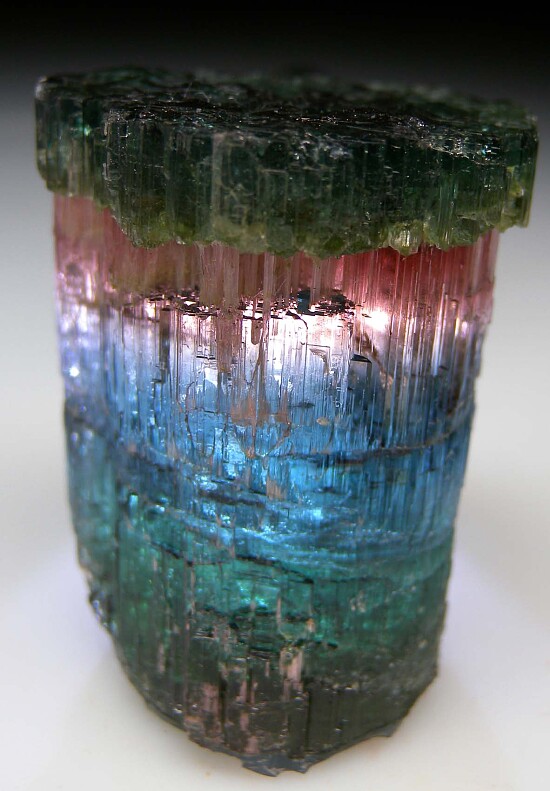 Stunningly colorful, etched gem Tourmaline from the Pederniera Mine. First, the form is unusual with an etched body and a wider termination with amazing geometric growth forms on the surface. Secondly, the color is superb grading up from green, to bright blue, to red, then back to blue/green at the termination. Weighs 60.57 grams. Ex. Tim Sherburn collection.