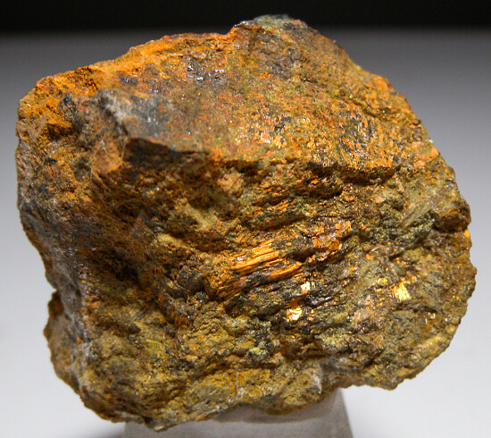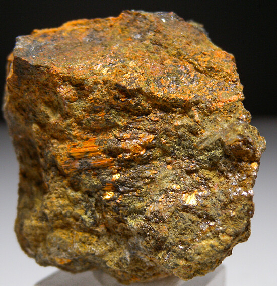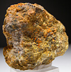 Fibrous red/orange crystals of Ludlockite on matrix from a recent find at the Ojuela Mine. This was found recently by a local miner searching for Legrandite and shipped directly to me from Mexico. A few specimens of Ludlockite from Mapimi were also available at the Tucson show in 2023. Ludlockite is a rare lead iron arsenite species and specimens were previously best known from the Type locality of Tsumeb. Ludlockite specimens from Tsumeb were found decades ago from a single boulder and are very hard to obtain. These recent specimens from Mexico make a once very difficult to obtain species available to collectors.