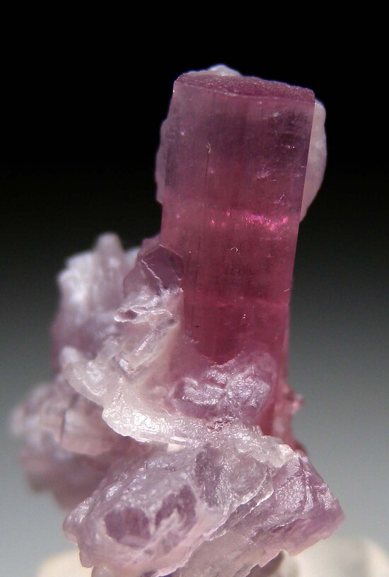Pink Tourmaline crystal rising out of a cluster of purple Lepidolite with smaller pink Tourmaline crystals. Undamaged floater well crystallized all around.