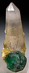 A colorful and clean looking specimen of green Fluorite, a tall single Quartz crystal, and yellow mica. Usually an accessory mineral, the Quartz crystal here proudly commands center stage. Both the Quartz and Fluorite have inclusions of Schorl. Highly aesthetic, undamaged specimen. Ex. Randy Parnagian collection.
