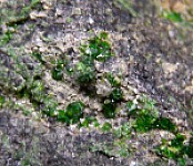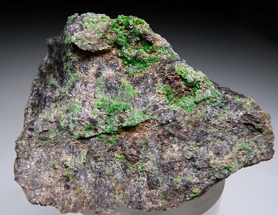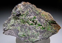 Classic California specimen of vivid green Uvarovite on Chromite. Crystals on both sides of specimen. Ex. Chuck Trantham.