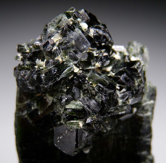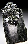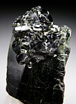 Actinolite cluster atop a larger Actinolite crystal from a new find in Tanzania. A larger, deep green crystal hosts a cluster of smaller, doubly-terminated crystals at the top.