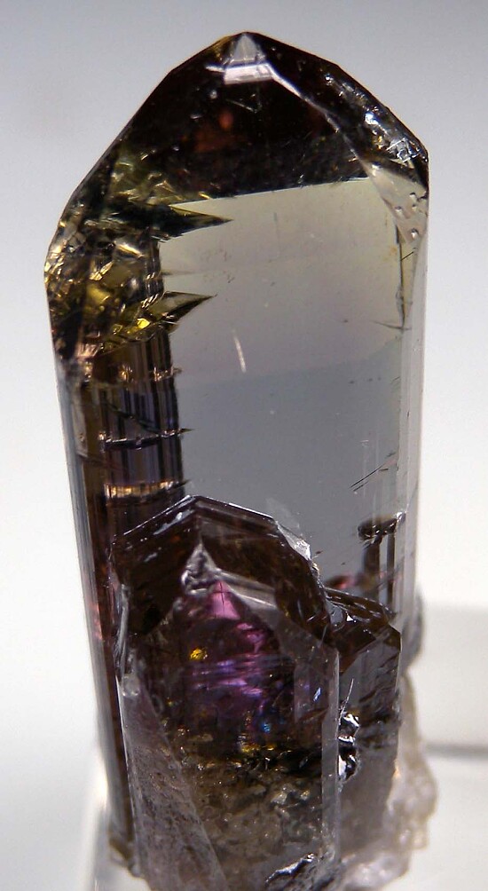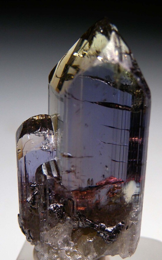 Stunning, glassy Tanzanite crystal with outstanding transparency and luster. The front face shows purple with a yellow tip. When viewed from the side, it's yellow/blue. Looking down the top (C-axis), it's yellowish with hints of orange. Beautiful water-clear crystal in near pristine condition with only a chip of the back of the small side crystal, otherwise undamaged. This is a fantastic gem crystal that won't dissappoint!