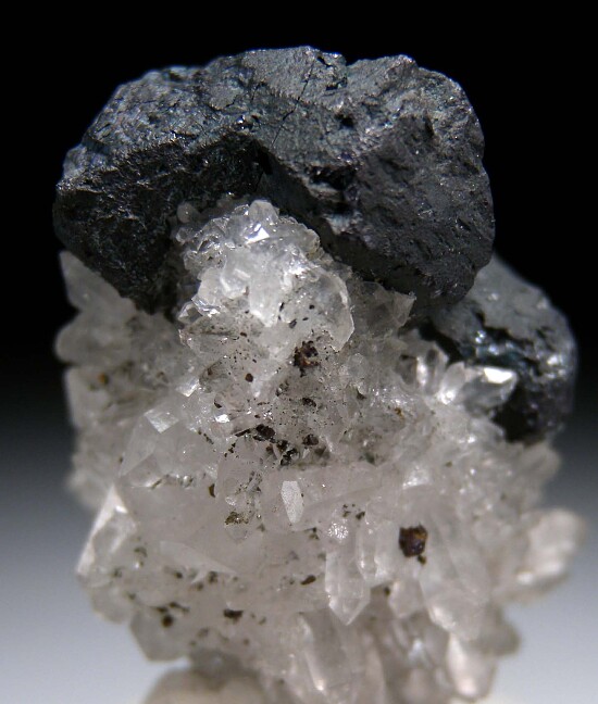 Fine miniature featuring 3 Bornite crystals on Quartz crystals. The Bornite are sharp and well formed with a slight blueish irridescent patina. This is an undamaged floater with crystals all around and no points of contact. Bornite from this locale are considered the world's best and this is a great one!