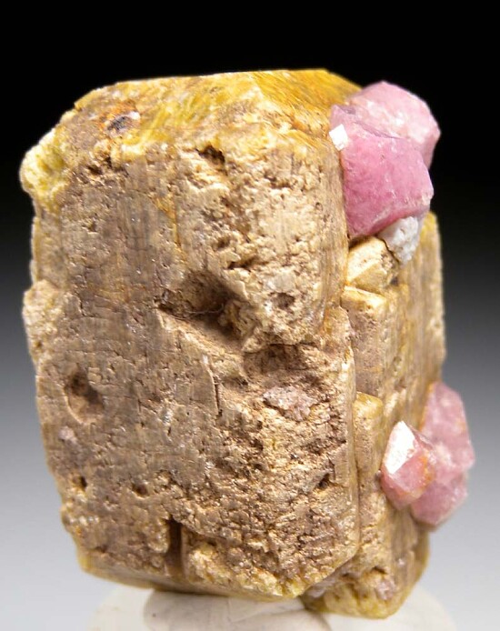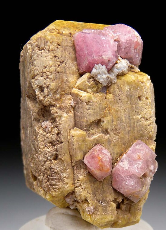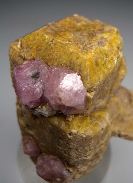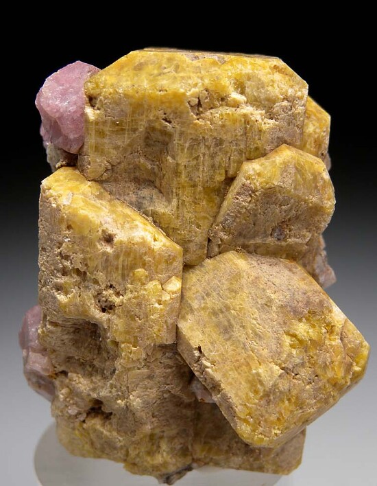 Large doubly-terminated yellow Vesuvianite crystal group with attached pink Grossular crystals. This is a larger sized, complete Vesuvianite crystal from a new find in Mexico. Crystals with attached pink Grossular were less common (most being wither without Grossular or with more grey Grossular). This is my last piece with good pink Grossular so get it now before they are all gone.