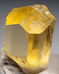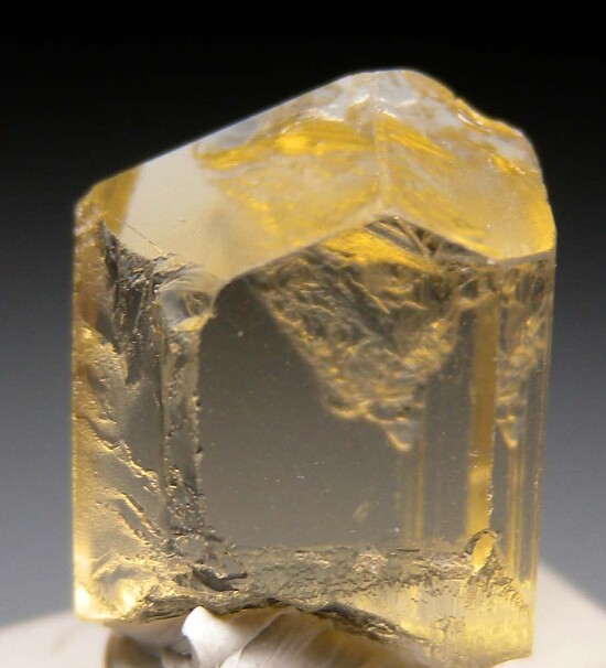 Transparent single golden Scapolite crystal from Tanzania. This a GEM, fully transparent facet quality that looks like glass. Has a couple edge chips, but with a good termination and still displays reasonably well and the transparency is remarkable. 13.2 carats of pure facet grade gem material.