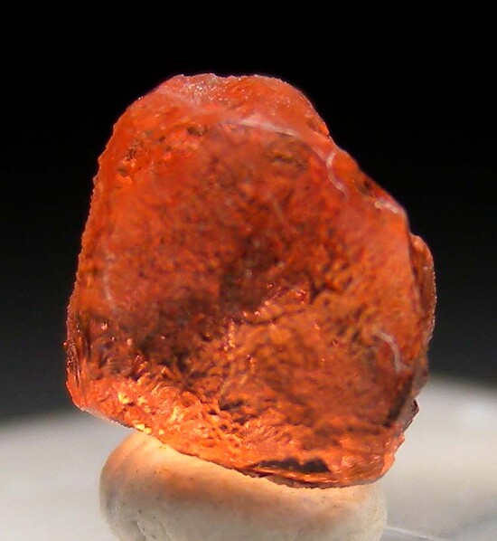 Transparent orange Villiaumite crystal from the open pit phonolite quarries in Aris, Namibia. These quarries, along with the Kola peninsula in Russia, are the source of the world's best Villiaumite. Although larger, the Kola specimens are a darker purple red and are typically just cleavages rather than crystals. These bright orange, transparent crystals are far more aesthetic for my taste. This crystal has etched outer surfaces and is internally transparent (faceted gemstones are known from this occurrence).