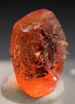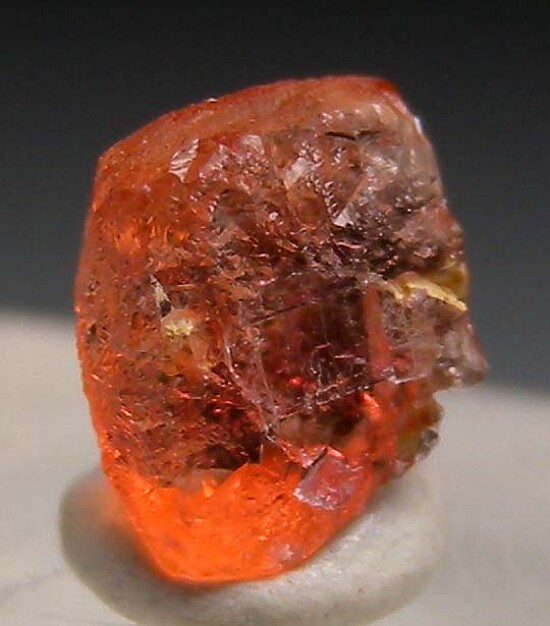 Transparent orange Villiaumite crystal from the open pit phonolite quarries in Aris, Namibia. These quarries, along with the Kola peninsula in Russia, are the source of the world's best Villiaumite. Although larger, the Kola specimens are a darker purple red and are typically just cleavages rather than crystals. These bright orange, transparent crystals are far more aesthetic for my taste. This crystal has etched outer surfaces and is internally transparent (faceted gemstones are known from this occurrence).
