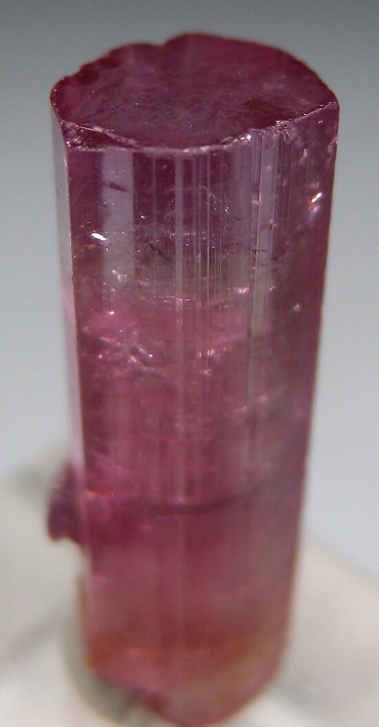 Gemmy single pink Tourmaline from the famous Stewart Mine in Pala. This mine is known for some of the brightest, intensely colored 'hot pink' Tourmaline. Complete and undamaged with good transparency, flat termination, color zoning, and attached lepidolite. Ex. Ed Swoboda. Weighs 1.58 grams. Valued at $300 (my last one).
