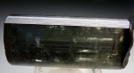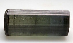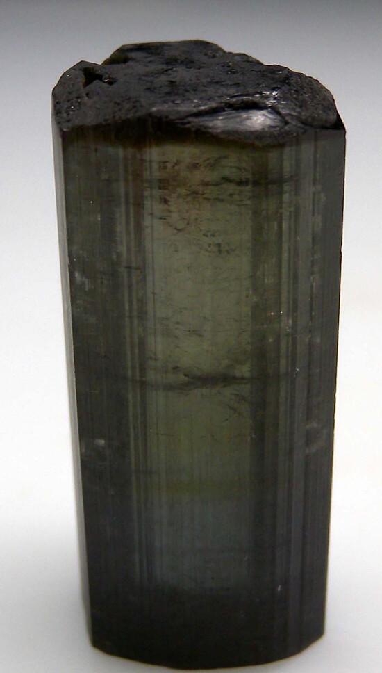 Transparent, doubly-terminated Tourmaline crystal from the Himalaya Mine. Complete and undamaged with a blueish black coloration on one half and a greenish black coloration on the other. A really interesting and unusual Tourmaline weighing 13.44 grams. Ex. Jeff Swanger collection.
