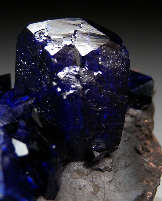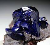 Highly lustrous, deep blue Azurite crystals on matrix. Main crystal is 1.5cm tall.
