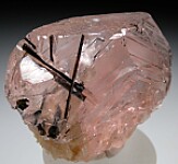 Highly transparent Morganite with attached and included dark green Tourmaline crystals. Undamaged crystal with a smooth, flat back face and a front face that projects outward in step-like fashion. Ex. Neil Levett collection. Ex. F&J Marshall collection purchased from Mineralogical Research Co. in 1999.