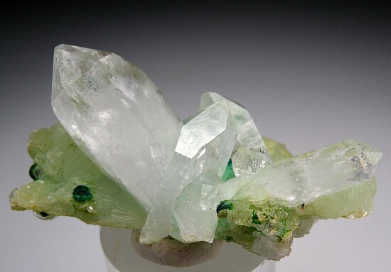 Colorful and aesthetic specimen of clear Quartz crystals, green Prehnite, and small spheres of attached Chrysocolla. What appears to be Copper is present inside one of the smaller Quartz crystals in the center of the specimen (not the red stain under the larger crystal to the right). Uncommon old Chinese specimen. Ex. Neil Levett collection.
