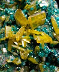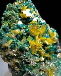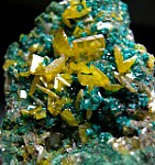 Yellow Wulfenite crystals to 8mm with Dioptase crystals on matrix. There are some chipped Wulfenite crystals but it's in overall great condition and super colorful and bright. Ex. Neil Levett collection from the Uli Bahmann collection.