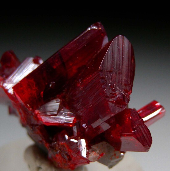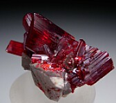 Cluster of transparent blood-red Realgar crystals with scalenohedral Calcite crystals from Shimen. Well terminated, bright red Realgar crystals that are seldom seen anymore. Ex. Neil Levett collection purchased by Neil in 1996.