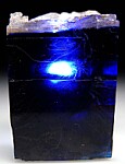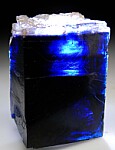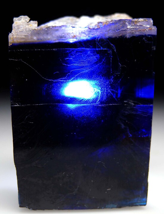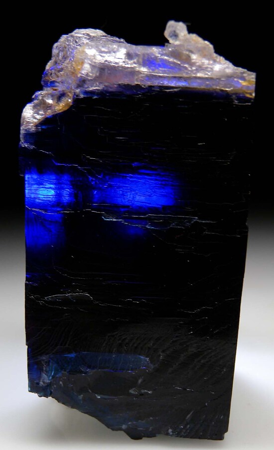 Large blue Halite with a superb deep blue color. This is a transparent Halite specimen with flat cleavage faces on four sides (like blue glass inside). When backlit you can see the incredible color. Due to the depth the light travels through the crystal, it's more blue in one direction and more purply blue in the other (though not so apparent in the photos). There is also a thin zone of colorless Halte on top (or possibly Sylvanite). The blue color is the result of exposure to natural radiation prior to mining. These are reportedly no longer being found. Was priced at $350 in my regular website galleries.