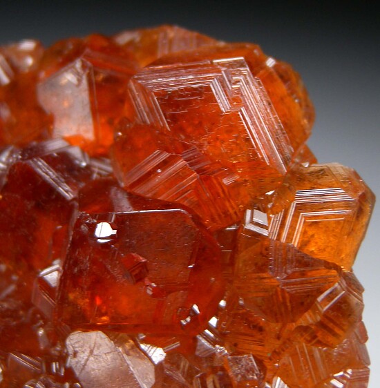 Transparent orange Grossular crystals from the Jeffrey Mine. Thin, flat spcimen of solid garnets with crystals on both sides (there appears to be a paper thin matrix running through the middle). Undamaged with gem quality crystals to 1.5cm in size.