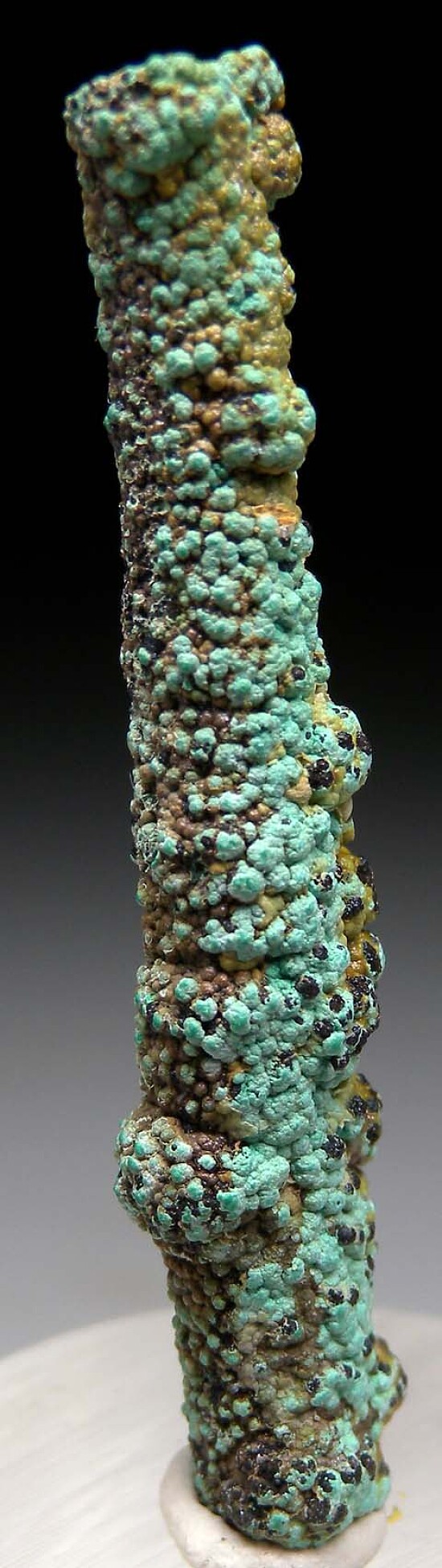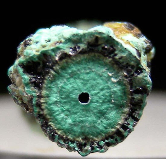 Slender single Malachite stalactite from Bisbee. The ends show hollow centers and concentric banding of the Malachite. Ex. John Dabney collection.