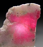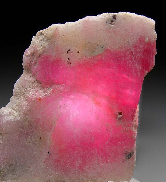Rare specimen of the flourescent beryllium silicate mineral Tugtupite from the Ilimaussaq Complex in Greenland. This is a flat cut slab of translucent pink Tugtupite with good color. Ex. Neil Levett collection.