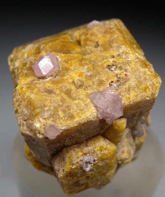 Four specimens of Vesuvianite and Grossular crystals from a recent find in Mexico (not the Lake Jaco occurrence!). There are 3 combos of yellow Vesuvianite with attached pink Grossular crystals (largest 5cm). My favorite has is a partial Vesuvianite with a glossy 1.3cm pink Grossular on top, complete and well formed (this specimen alone is worth $50). There is also a single Vesuvianite crystal with dark golden coloration, translucent and partially double-terminated.