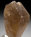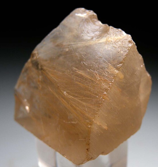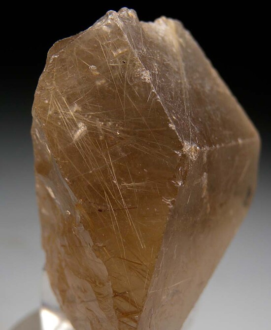 Transparent Smokey Quartz crystal with included golden needles of Rutile. The Quartz is transprent and there are a couple saw cuts indicating this was going to be cut into a gemstone at one point. There are 3 good crystal faces on front.