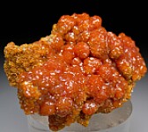 Botryoidal, satiny orange, arsenian Pyromorphite crystals on a small amount of matrix. The crystal groups translucent with rich orange color. Obtained via trade, the previous collector paid $2,500 for this back in 2017. Ex. Rosey collection.